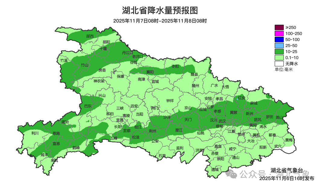 11月7日08时-8日08时,全省阴天有小到中雨,局地伴有雨雾。最高气温鄂东南18~21℃、其他地区15~17℃,最低气温12~15℃,偏北风2到3级转3到4级、阵风5到6级。
