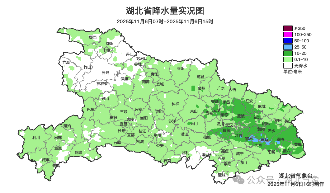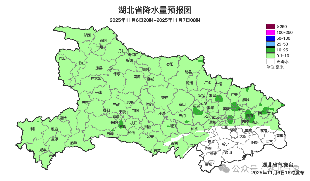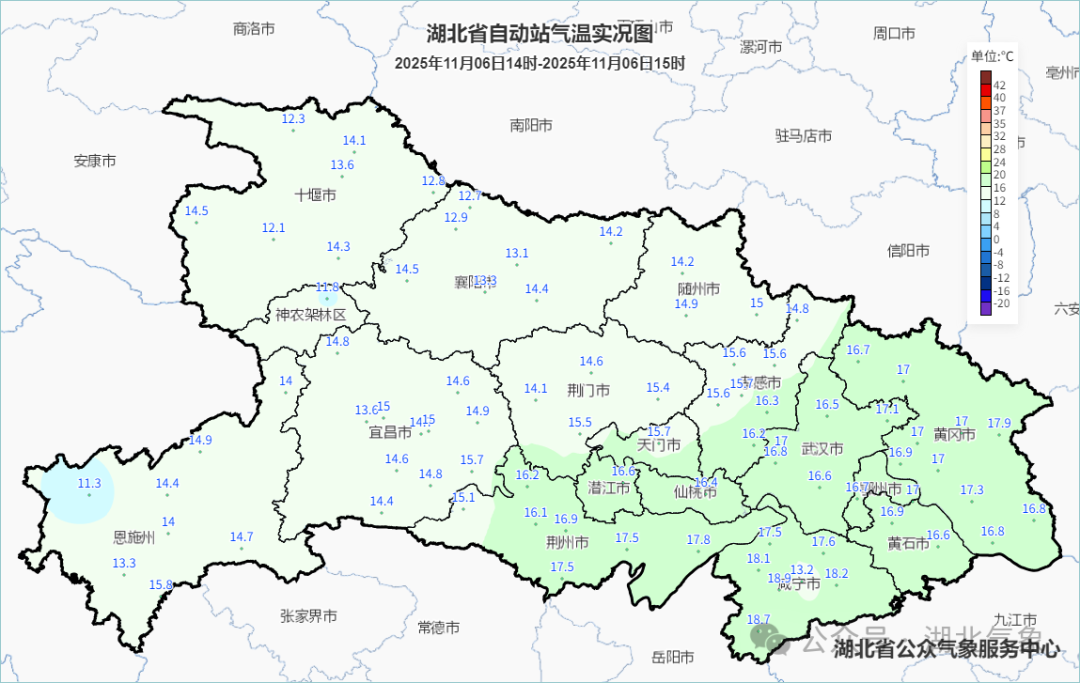 11月6日20时-7日08时,鄂东南阴天,局地有零星小雨;其他地区阴天有小雨,局地中雨。局地伴有雨雾。最低气温12~15℃,偏北风2到3级。