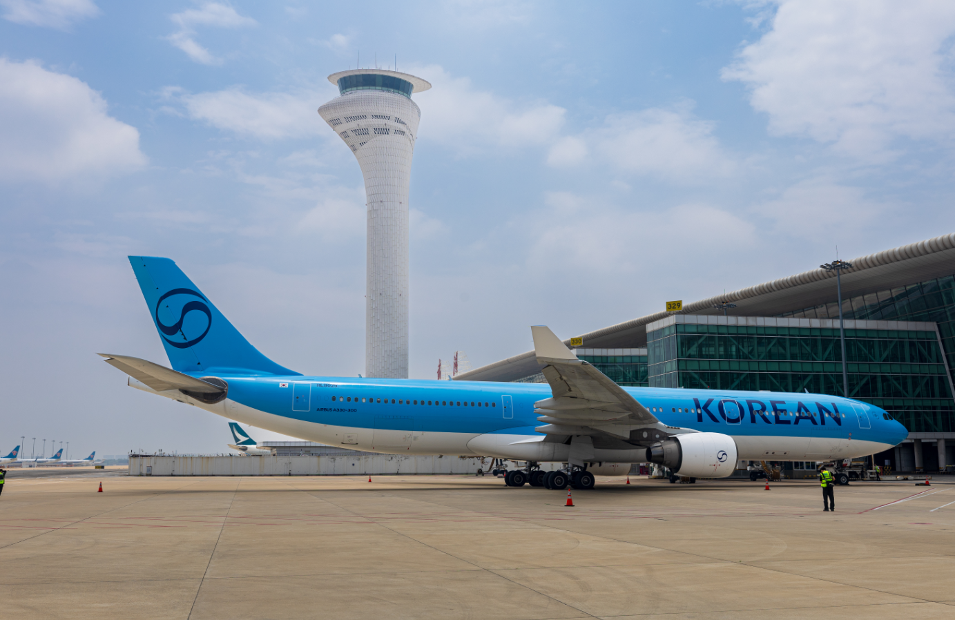 ▲大韩航空韩国首尔直飞武汉航班降落天河机场