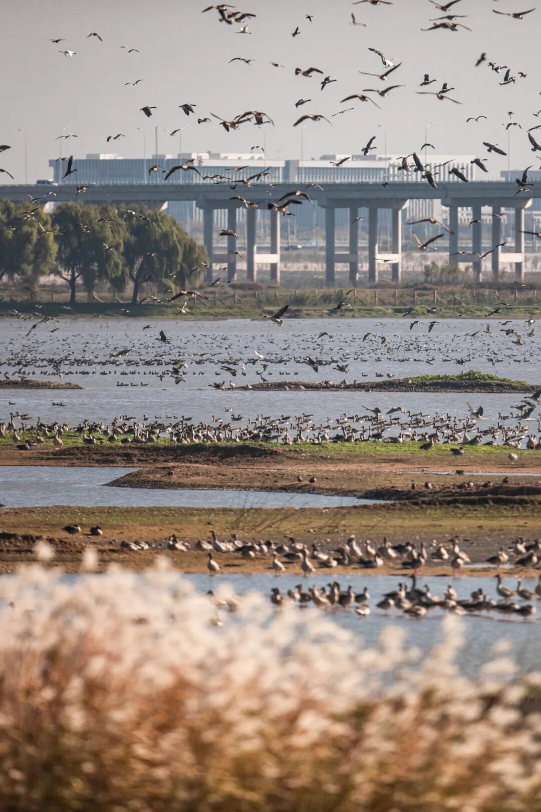 远眺府河,水面上聚集了短嘴豆雁、灰雁、绿头鸭、绿翅鸭、赤膀鸭、赤颈鸭等多种鸟类,有的悠然划水,有的低头觅食,有的嬉戏追逐。这群远道而来的客人用翩跹身影,为冬日的湿地注入了蓬勃生机。