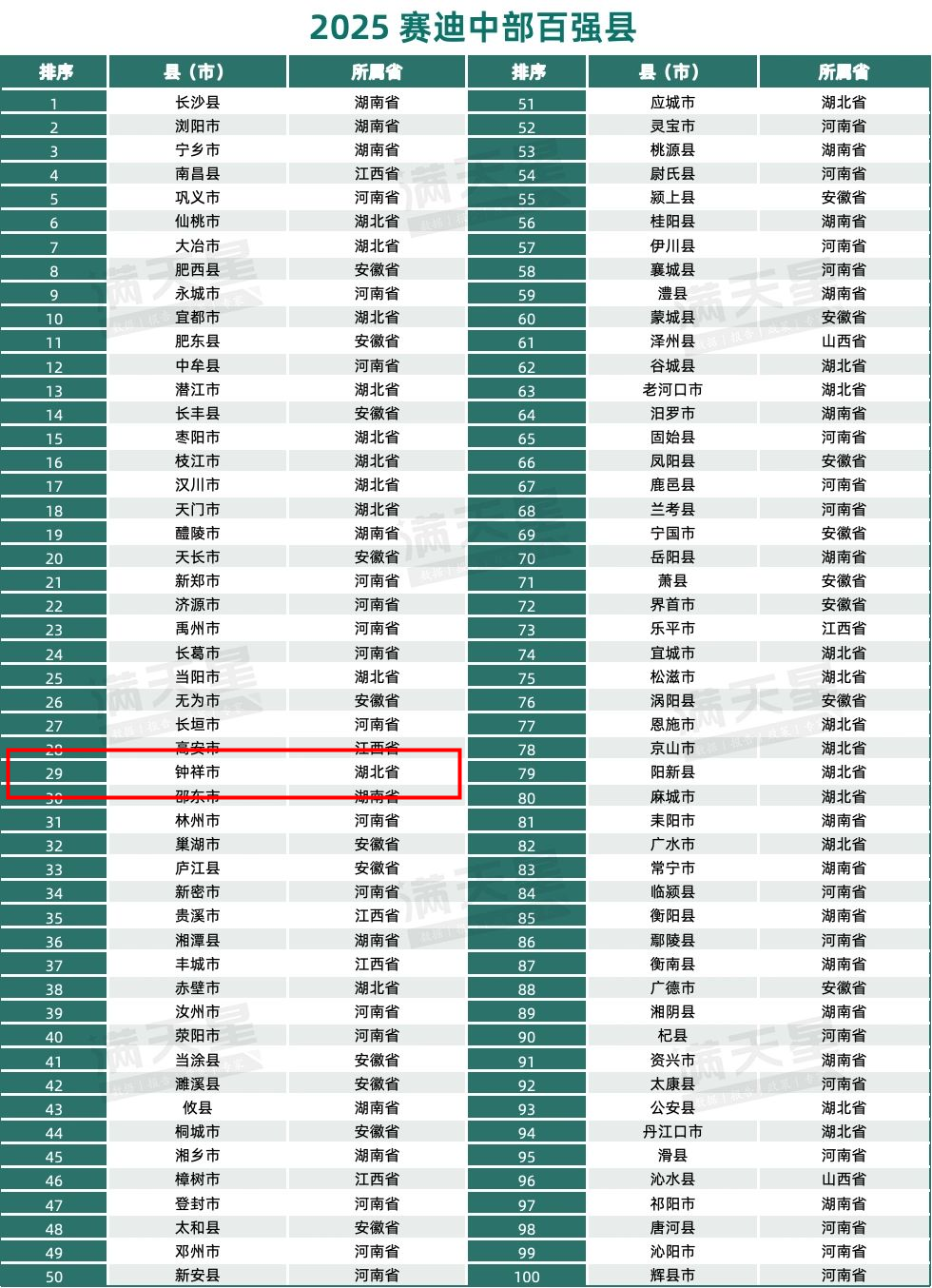 11月6号,赛迪顾问发布2025中西部县域经济高质量发展研究成果,揭晓了2025赛迪中部百强县榜单。钟祥市榜上有名,位列29位。