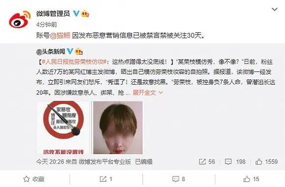 记者注意到,早在2020年,就发生过一起网红博主因模仿劳荣枝而被平台禁言的事件。