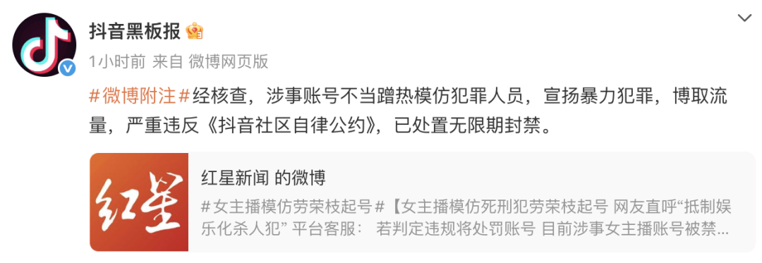 主播模仿劳荣枝直播!抖音:无限期封禁