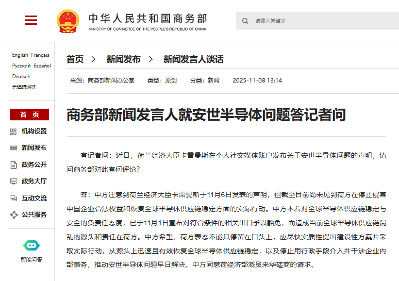 有记者问:近日,荷兰经济大臣卡雷曼斯在个人社交媒体账户发布关于安世半导体问题的声明,请问商务部对此有何评论?
