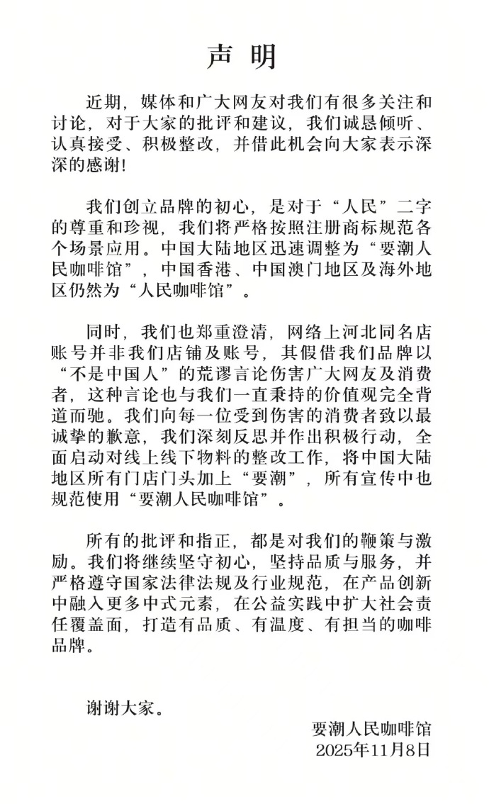 我们创立品牌的初心,是对于“人民”二字的尊重和珍视,我们将严格按照注册商标规范各个场景应用。中国大陆地区迅速调整为“要潮人民咖啡馆”,中国香港、中国澳门地区及海外地区仍然为“人民咖啡馆”。