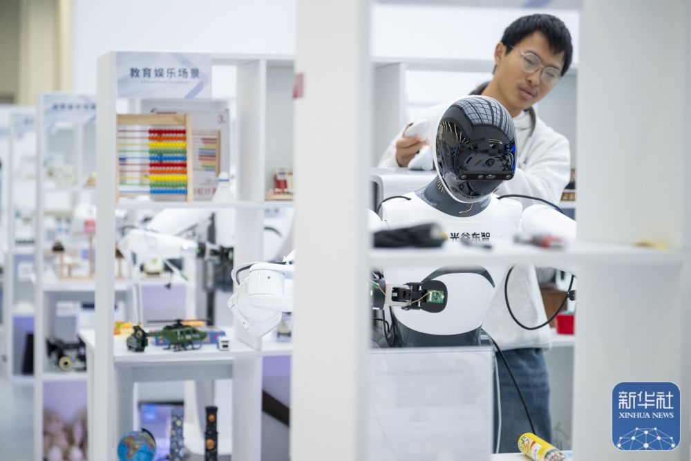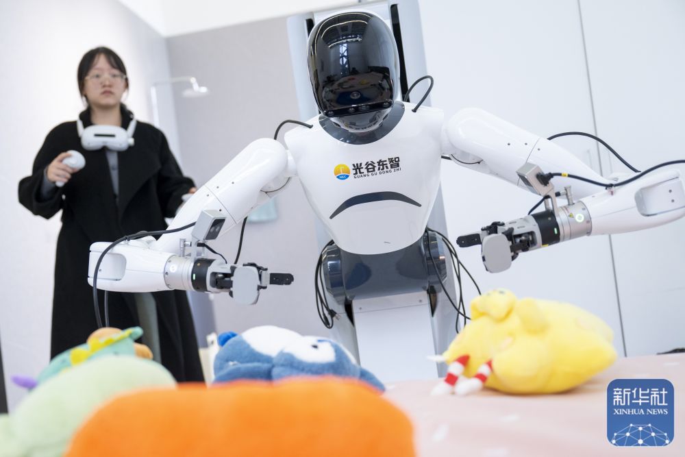 ↑ 11月6日,在湖北人形机器人创新中心,人形机器人数据采集员在进行数据采集工作。新华社记者 伍志尊 摄
