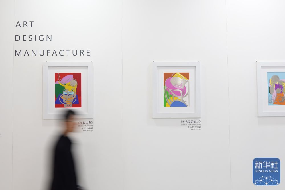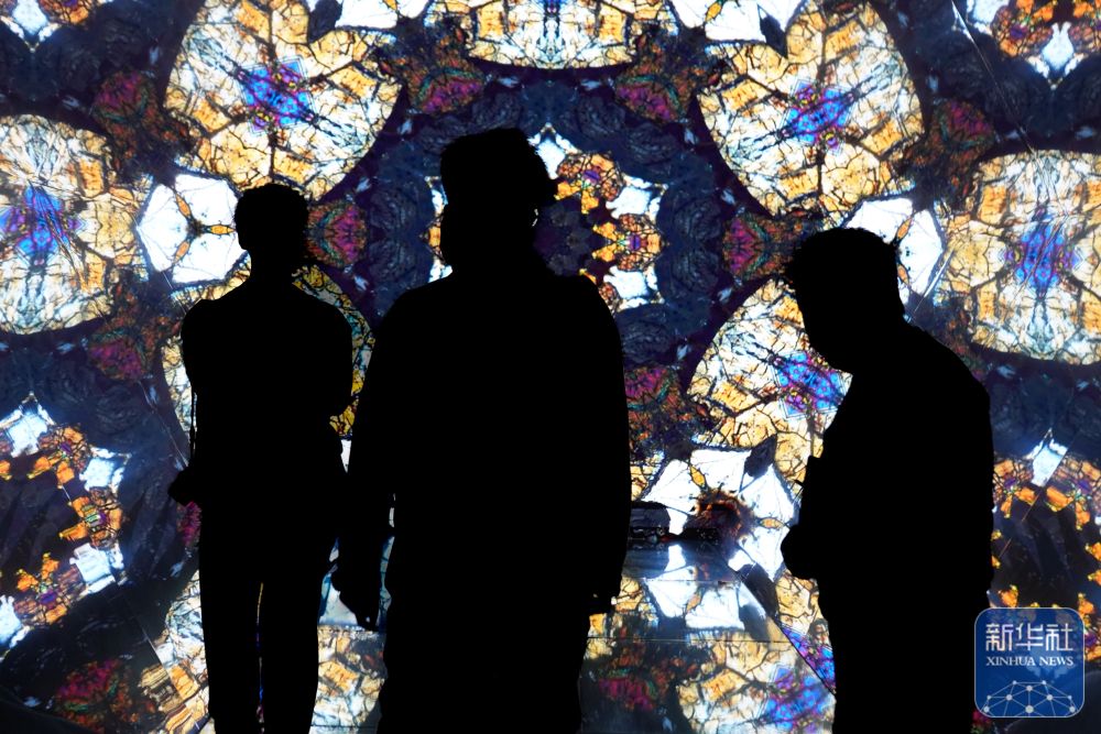 ↑ 11月6日,一名参观者路过华工科技激光科技馆内由激光技术二次创作的绘画作品。新华社记者 戴明轩 摄