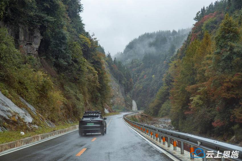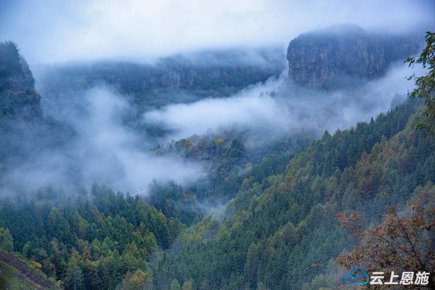 雨雾中的建南峡谷,则多了几分神秘与深邃。细雨霏霏,云雾缭绕,山峰隐入白茫茫的雾气中,只露出隐约的轮廓。雨水打湿了红叶,愈发显得娇艳欲滴;浸润了崖壁,风化成各种图案的绝壁在云雾中时隐时现,有的如猛兽盘踞,有的如仙人指路,任由人驰骋想象。汽车穿行在秋色与云雾之间,窗外的景致如流动的画卷,朦胧中带着诗意,让人分不清是在画中走,还是在梦中游。雨雾既洗去了尘埃,也洗净了心灵的浮躁,只剩下纯粹的宁静与安然。