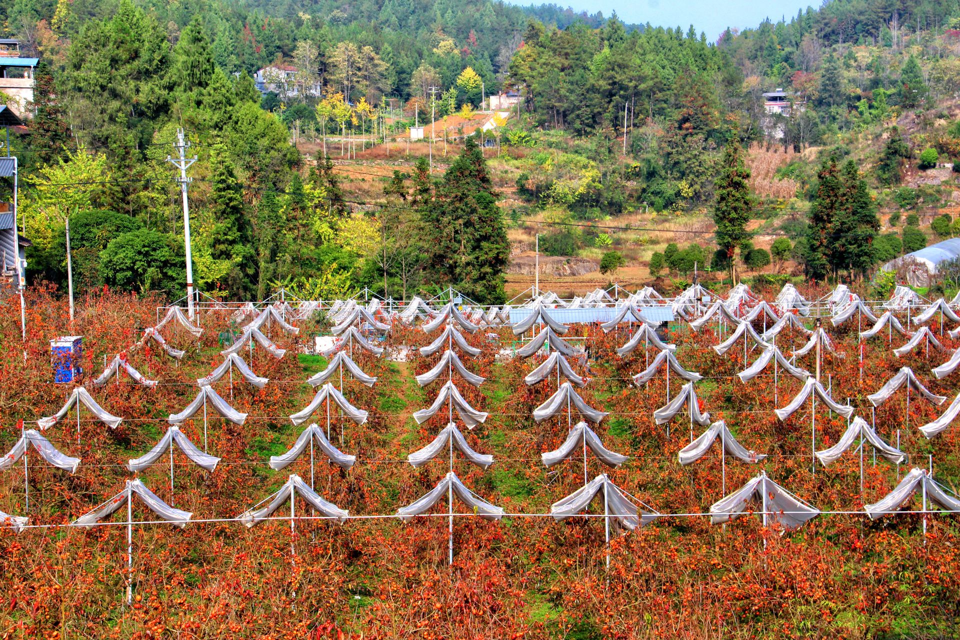 立冬时节,湖北恩施建始县业州镇的柿子林披上橙红彩装。