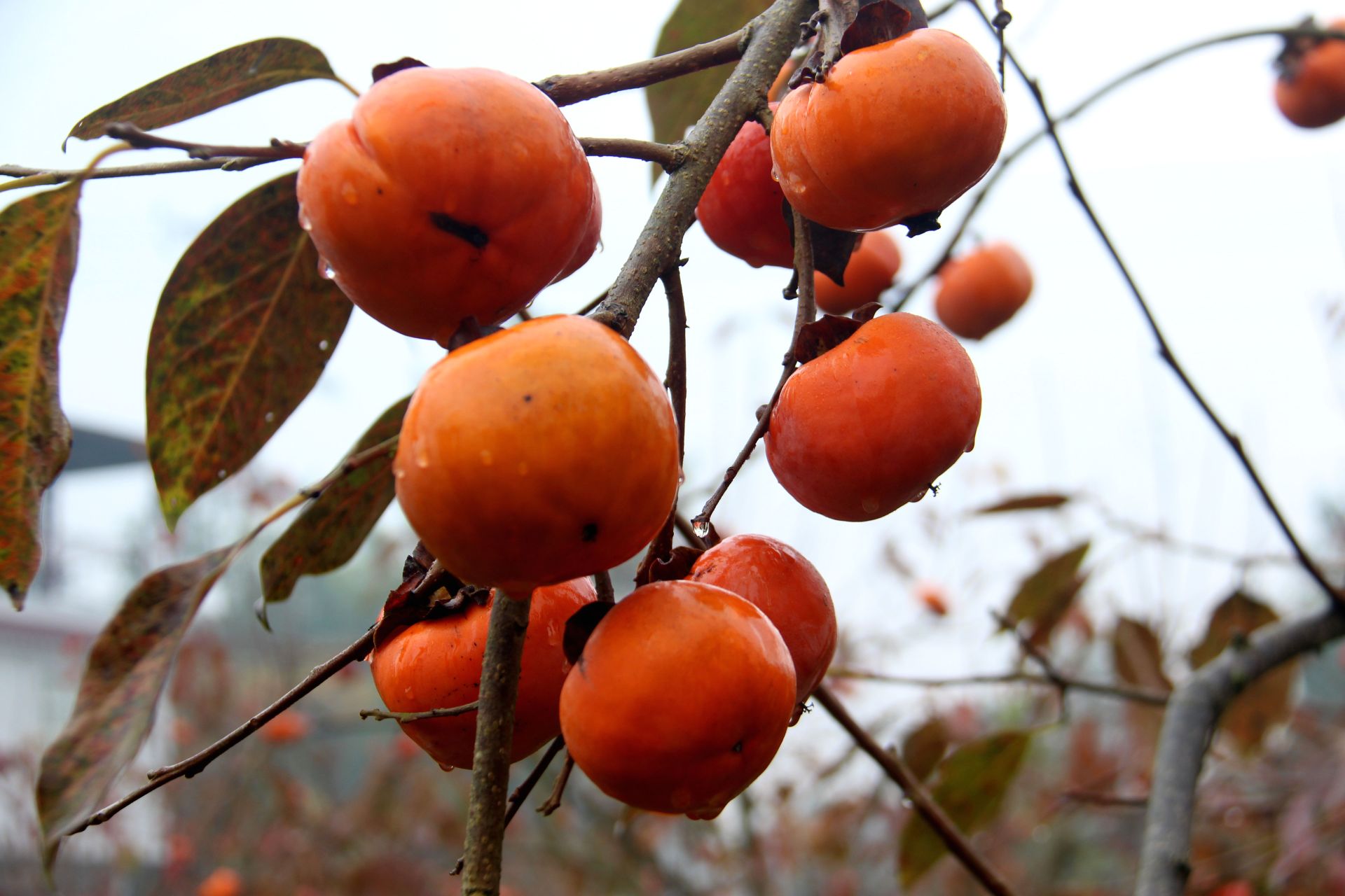 柿子密密匝匝挂满枝头,圆润饱满的果实由橙黄渐变为深红,雨后挂着晶莹水珠,如玛瑙般剔透诱人。它们或簇拥相依,或独立枝头,与绿叶、远山相映,构成诗意的田园画卷。