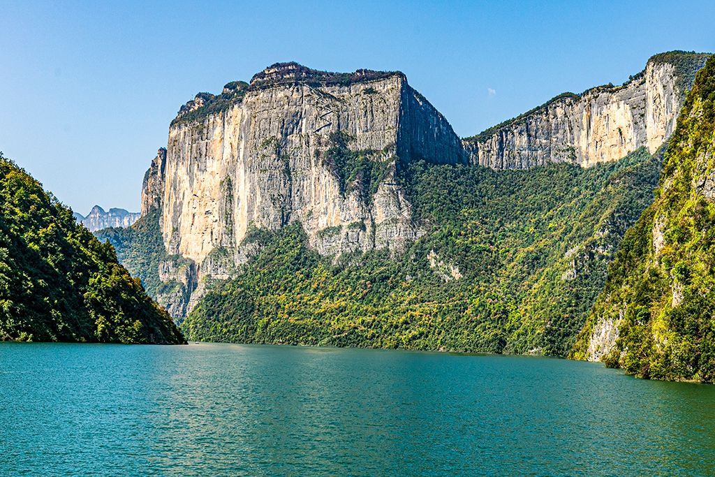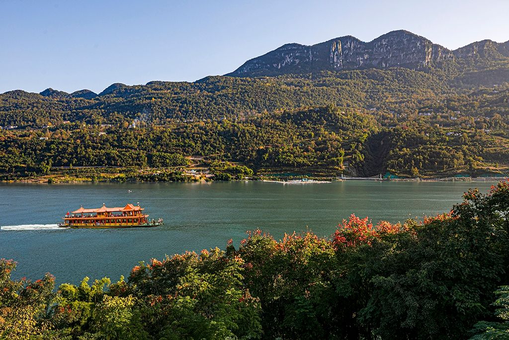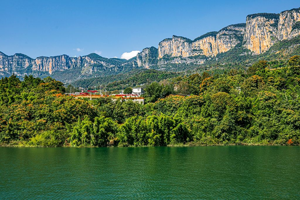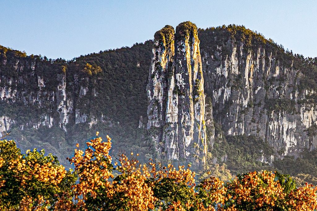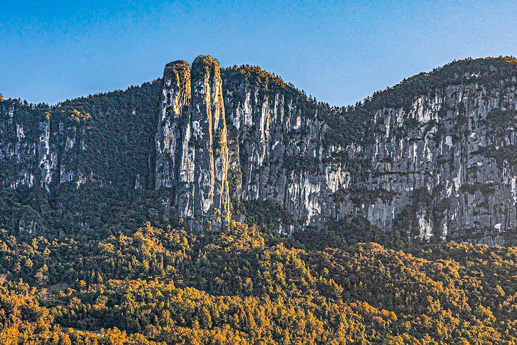 晚秋时节,步入清江画谷,便与景阳清江的秋色不期而遇,撞了个满怀。清江绿水如绸,波光潋滟,景色分外醉人。两岸峭壁如一道道斑斓的屏风,透出清亮的红、明艳的黄、青翠的绿,将这一江秋意点缀得浓郁而饱满,令人心旷神怡。此刻,清江之畔的蝴蝶岩、双石柱、板壁岩,古道景阳关以及那延绵七千米的巍峨峭壁,在秋的渲染中更显绚丽多姿,平添几许诗情与画意。