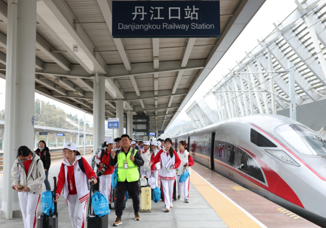 “十堰,我们来啦!”10日13时29分,由北京西站始发的研学专列准时抵达汉十高铁丹江口站。刚一走出列车车厢,便有学生按捺不住激动欢呼起来。在简短的欢迎仪式后,研学团成员分乘大巴车抵达丹江口市城区。