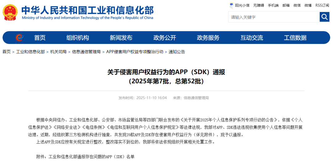 根据中央网信办、工业和信息化部、公安部、市场监管总局等四部门联合发布的《关于开展2025年个人信息保护系列专项行动的公告》,依据《个人信息保护法》《网络安全法》《电信条例》《电信和互联网用户个人信息保护规定》等法律法规,工业和信息化部对App、SDK违法违规收集使用个人信息等问题开展治理。近期,经组织第三方检测机构进行抽查,共发现39款App及SDK存在侵害用户权益行为(详见附件),现予以通报。