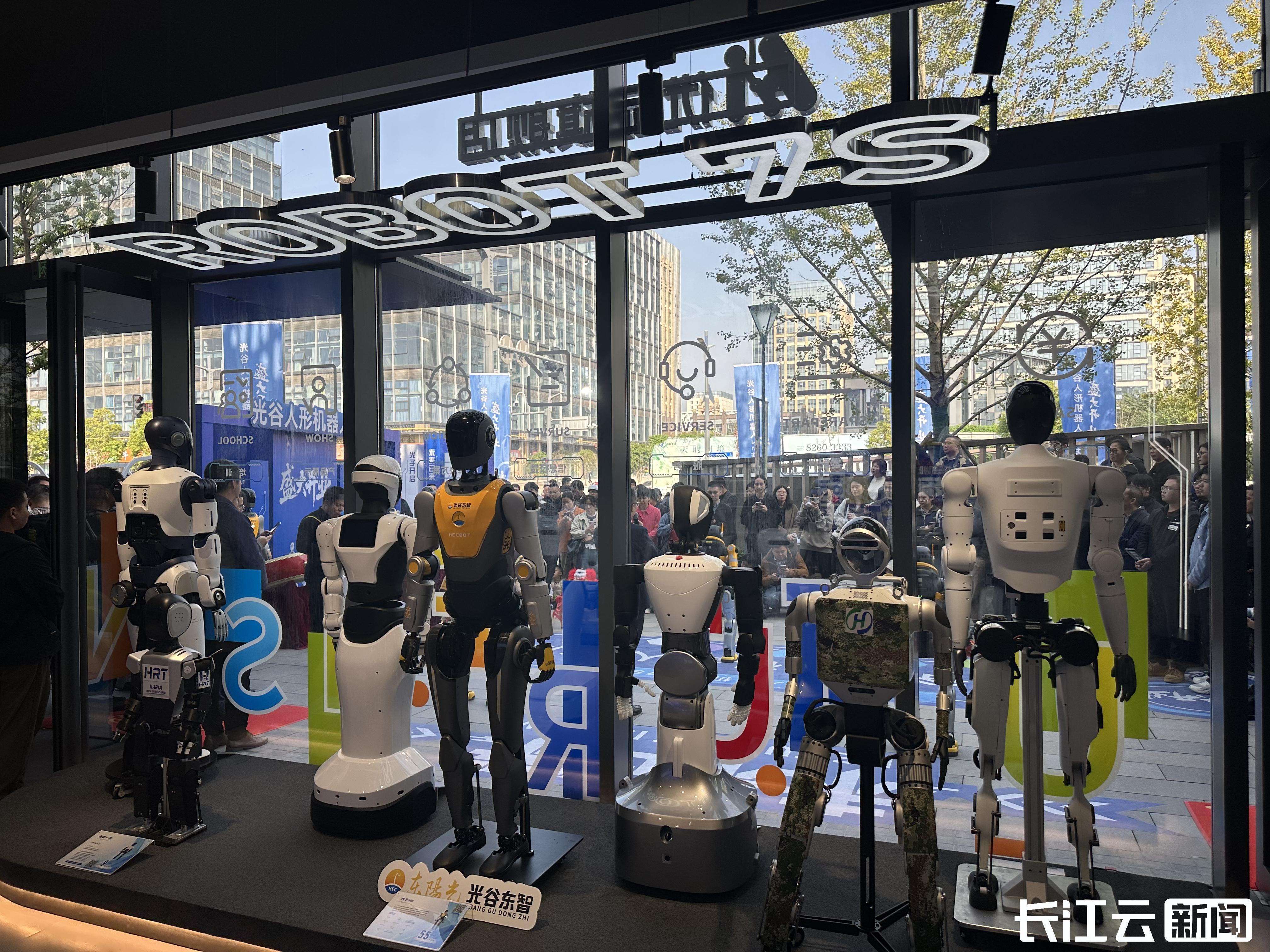 11月11日,全国首家人形机器人7S店,在光谷创新天地商业公园正式开业。一群“机器人同事”在光谷迎接第一批客人。走进展厅,最先映入眼帘的,是湖北自研人形机器人家族的集体亮相——格蓝若的“劳动者”、手智创新的“远游”、湖北启灵的“神农”、荆楚机器人的“精灵”、光谷东智的“光子”、光谷华汇的特种机器人,还有来自华科HRT团队的小人形机器人……它们或挥手致意,或俯身作揖,动作流畅自然。参观者纷纷举起手机,记录这场“未来生活”的预演。