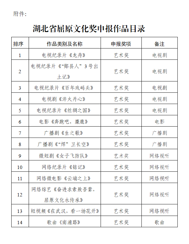 根据《中共湖北省委宣传部湖北省人力资源和社会保障厅关于做好湖北省屈原文化奖评选工作的通知》要求,湖北广播电视台精心组织、认真审核,现将收到的符合评选要求的14件作品进行公示(具体篇目附后)。