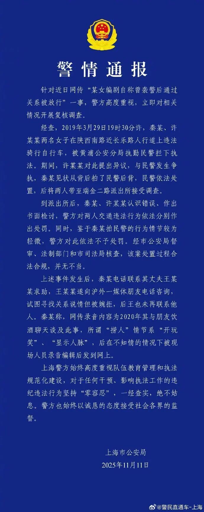 11月11日,上海警方一纸通报,把前段时间闹得沸沸扬扬的“编剧吹牛事件”给彻底说明白了。简单来说,就是2019年,编剧秦雯和她朋友因为骑车上了人行道被警察拦下。朋友和警察争执时,秦雯从背后拍了警察一下。结果就是,骑车违章,该罚的罚了;而她拍那一下,因为情节太轻,所以没有处罚。
