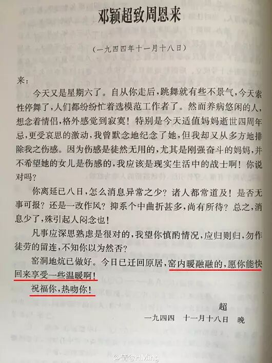 周恩来赴渝已经八天,邓颖超说:“窑内暖融融的,愿你能快回来享受一些温暖啊!”