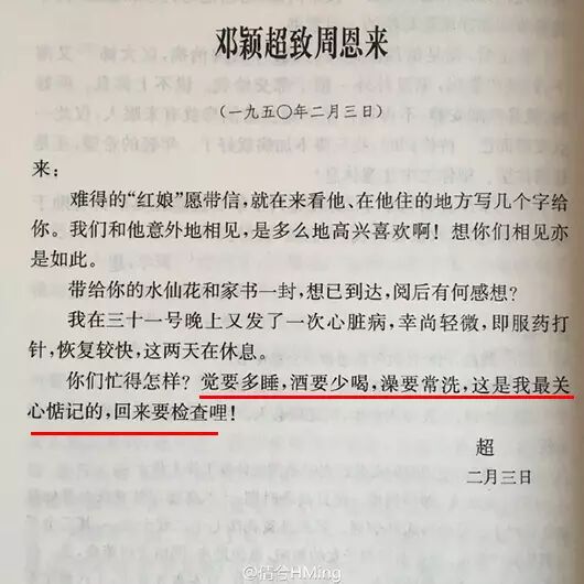 邓颖超心脏病发,在家休养,对丈夫的关心也丝毫未减:“觉要多睡,酒要少喝,澡要常洗,这是我最关心惦记的,回来要检查哩!”