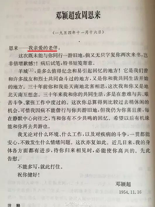 这时的邓颖超称周恩来“恩来——我亲爱的老伴”,两人也已相伴超过十年。