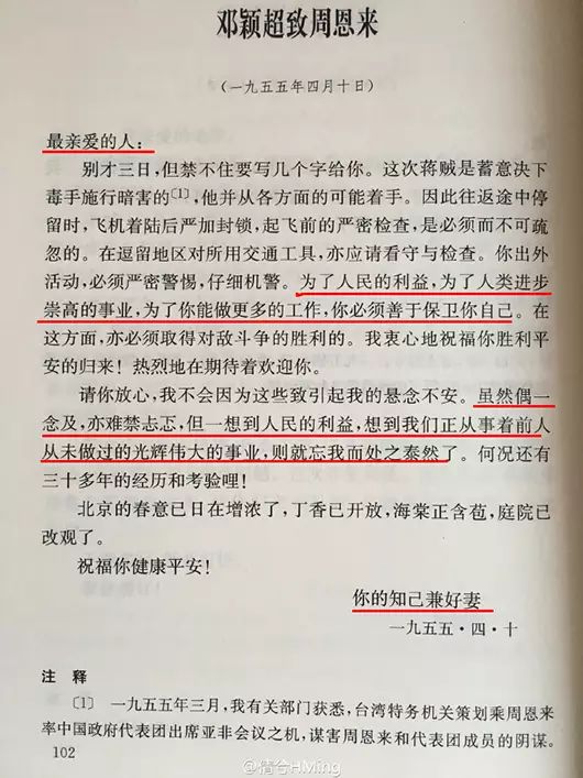 1955年3月,台湾策划谋害周恩来,邓颖超抱病提笔:“别才三日,但禁不住要写几个字给你……为了人民的利益,为了人类进步崇高的事业,为了你能做更多的工作,你必须善于保卫你自己。在这方面,亦必须取得对敌斗争的胜利。我衷心地祝福你胜利平安的归来!热烈的在期待着欢迎你。”