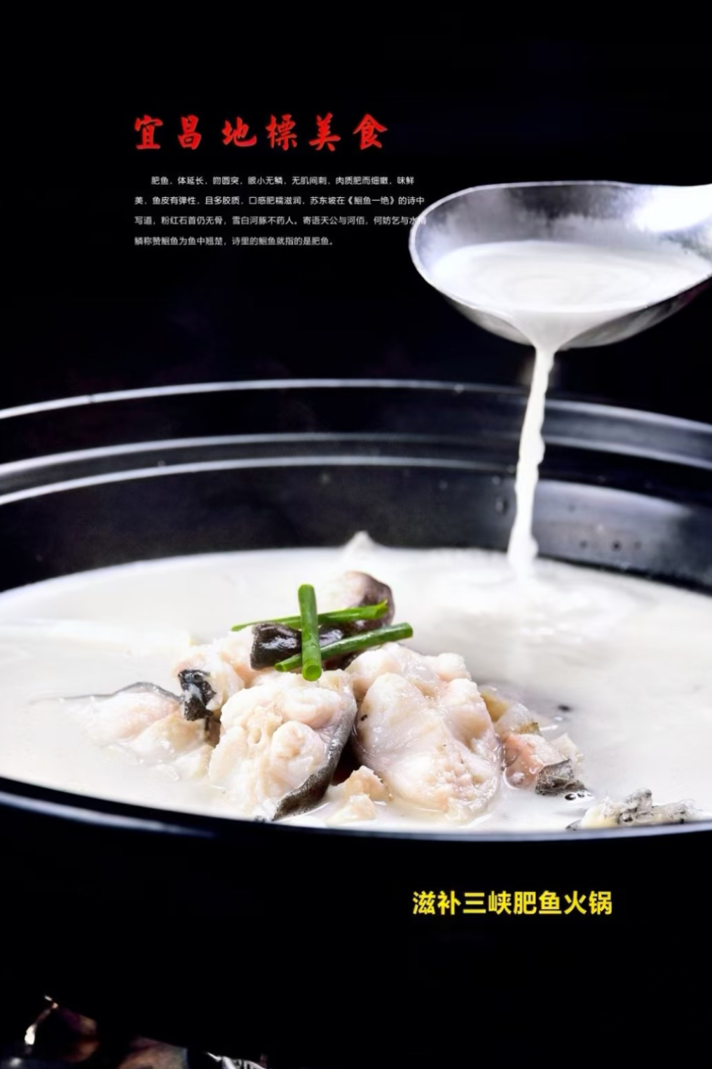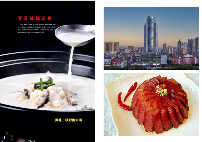 “峡江风情”套餐,肥鱼为宜昌特产,其鱼肉质细嫩、无肌间刺、入口即化;尤其所炖鱼汤润泽爽口;其鳔肥厚,自古以来为食中珍品。腊肉为精选黑土猪带皮肉,经盐与花椒等香料腌制后,用松柏枝、果壳等天然燃料烟熏1个月以上,做法包括蒸煮、爆炒或与辣椒、蒜苗、土豆等食材搭配。