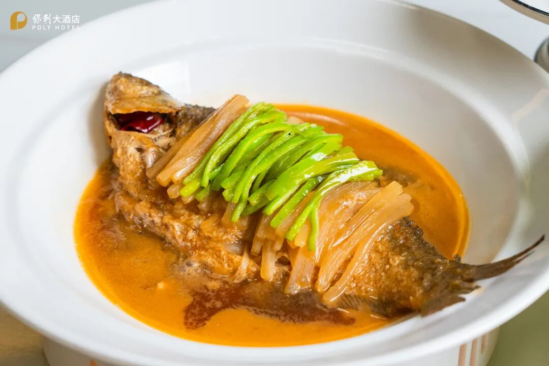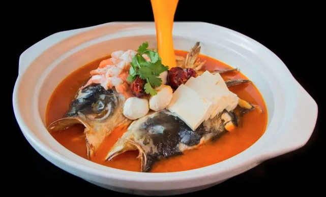 餐厅必点菜勾魂大鱼头选用襄阳6-8斤花鲢鱼头,鱼骨小火慢炖4小时作汤底,加以黄灯笼椒等调味,搭配豆腐、海虾、手工油条,鱼肉入味,汤鲜浓郁,唇齿留香。