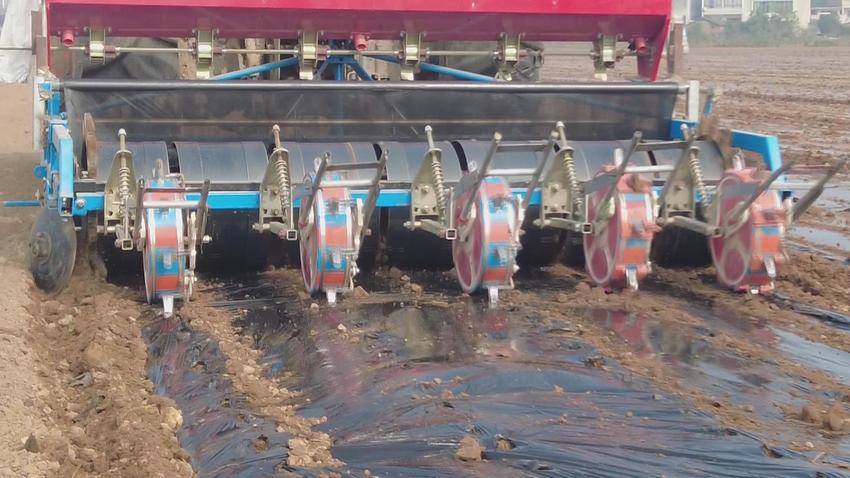 走进庙滩镇的油菜种植基地,村民们正有条不紊地忙碌着。伴随着播种机缓缓前行,一张黑色地膜被均匀铺设在田地上。随后,一粒粒油菜籽通过转轴上的小孔精准穿透地膜,落入土壤,完成高效播种。