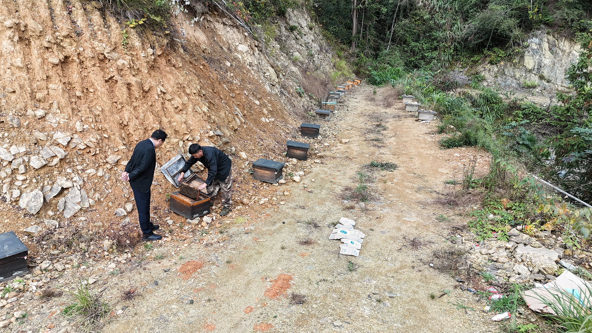 野桂花蜜是当地独有的一种资源,深受消费者的喜爱。路通了,叶国辉就盯上了满山的野桂花树,他提议村民扩大蜂群养殖规模,从最初几户几十箱蜂,一步步发展到如今1500箱。担心村民没经验,他自己学习了相关知识,从蜂群管理、病虫害防治到蜂蜜采收技巧,手把手地传授给大家。