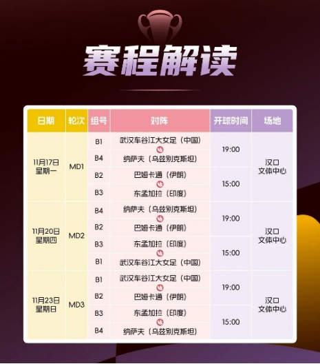 新赛季的女足亚冠B组小组赛将于11月17日至23日在汉口文体中心举行。四支球队将通过单循环比赛决出小组排名,争夺晋级淘汰赛的资格。