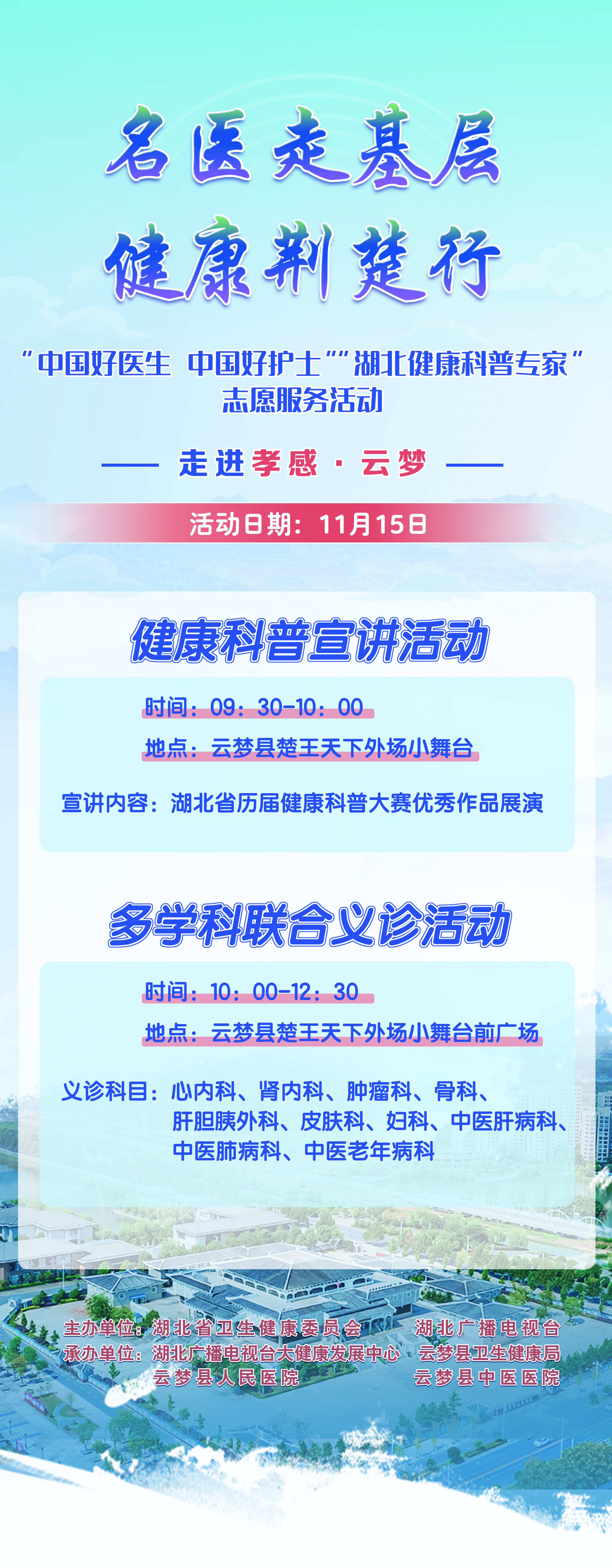 不用跑省城、不用抢挂号!11月15日(本周六),“名医走基层 健康荆楚行”暨“中国好医生 中国好护士”志愿服务活动走进云梦县,10多位省级三甲医院专家组团坐诊,还有实用健康科普、免费药品发放,家门口的医疗福利,可千万别错过!