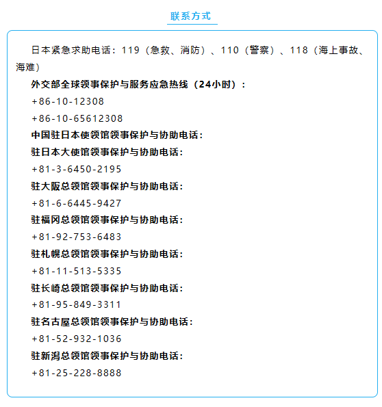 外交部和中国驻日本使领馆郑重提醒中国公民近期避免前往日本,已在日中国公民密切关注当地治安形势,提高安全防范意识,加强自我保护。如遇紧急情况,请及时报警并联系驻日使领馆寻求协助。