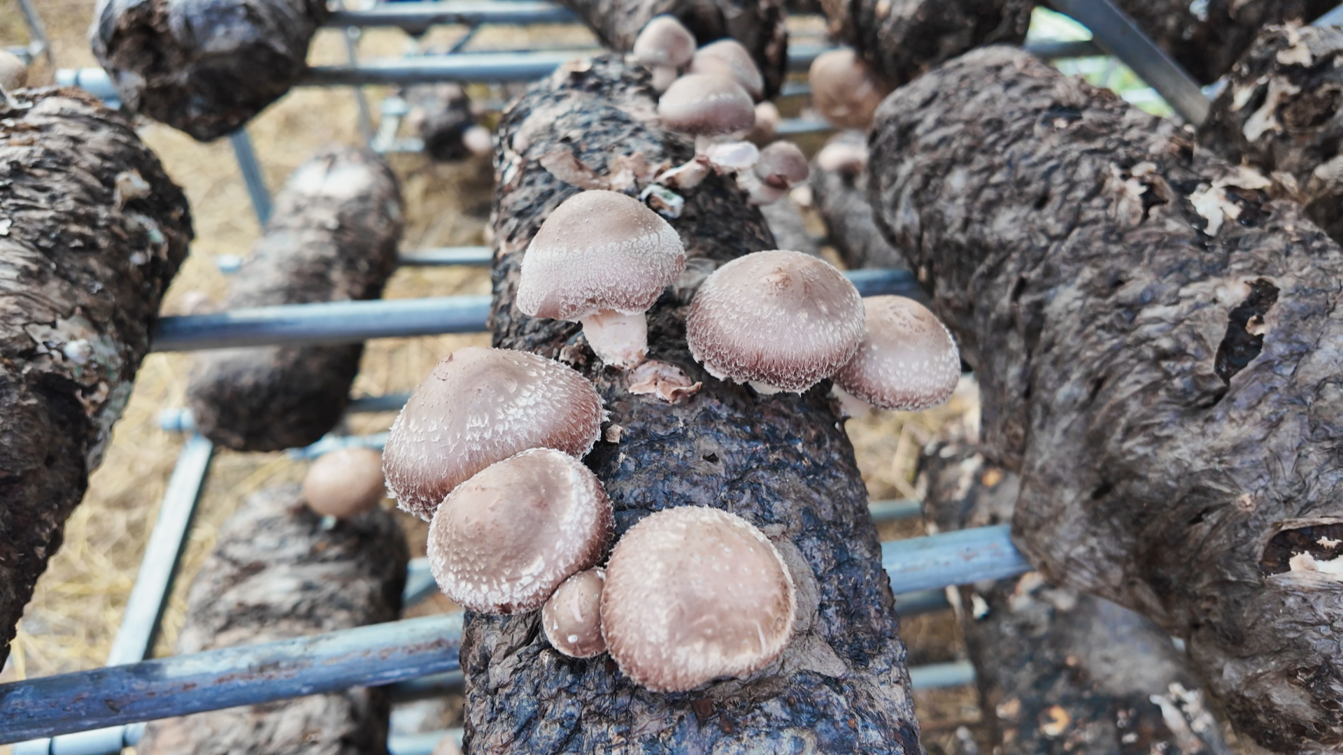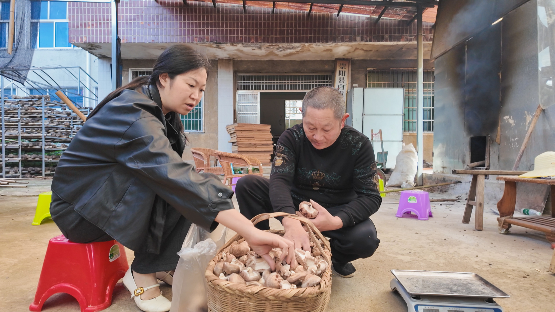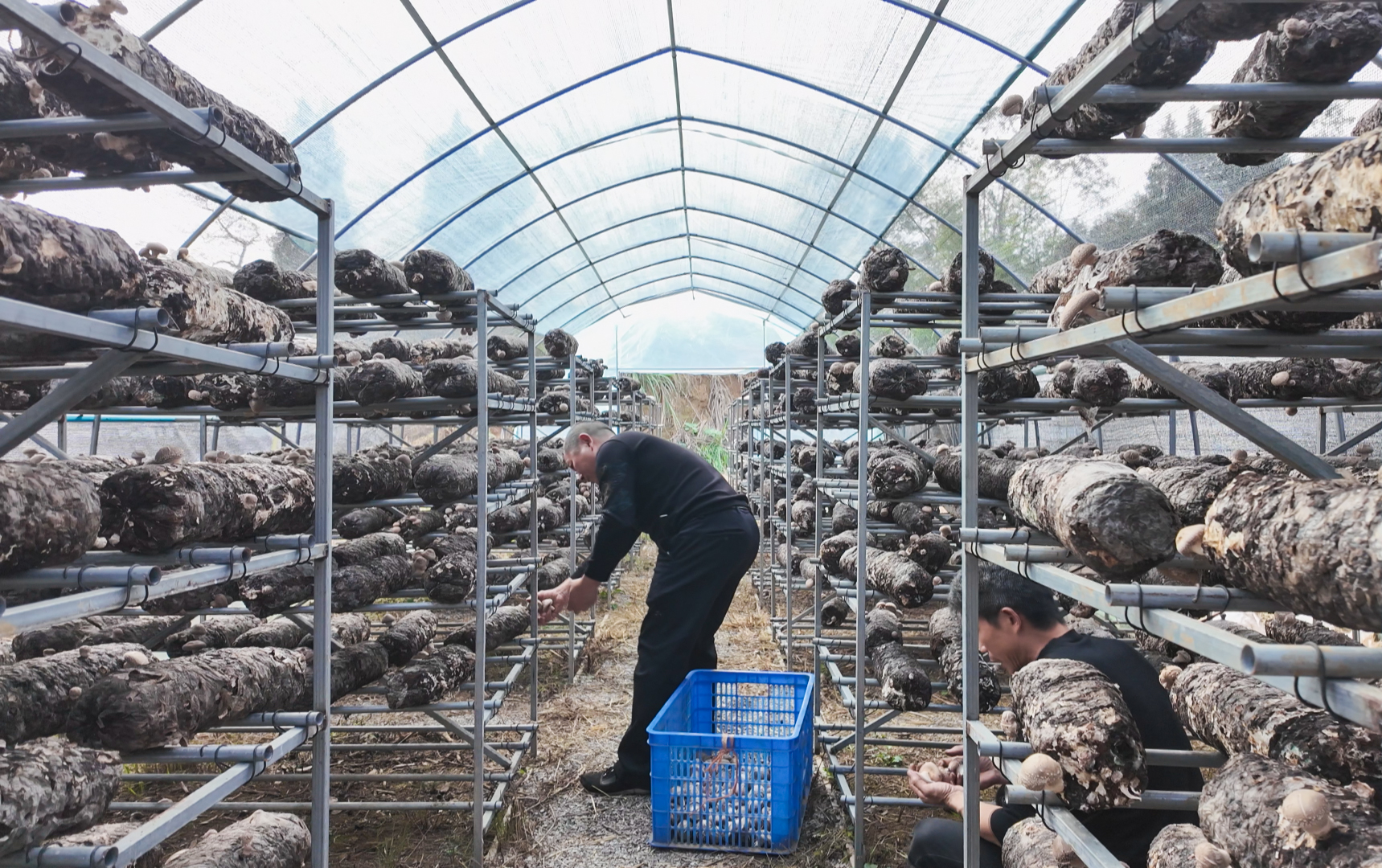 走进菌棚,菌棒层层叠叠,一朵朵浅褐色的香菇圆润饱满。村民们小心翼翼地将成熟的香菇摘下,整齐码放进竹筐中。新鲜采摘的香菇刚运出棚外,便吸引不少顾客前来选购。