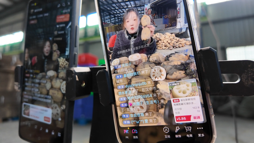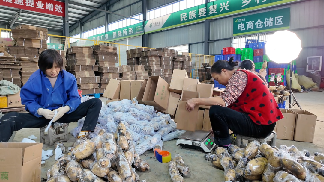 在孝昌县寄递物流共配中心,鑫悦农电商负责人饶洁洁正通过网络直播分享当地应季的粉糯莲藕,工人们在一旁熟练地分拣、打包。