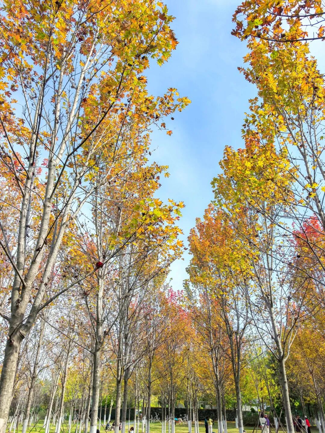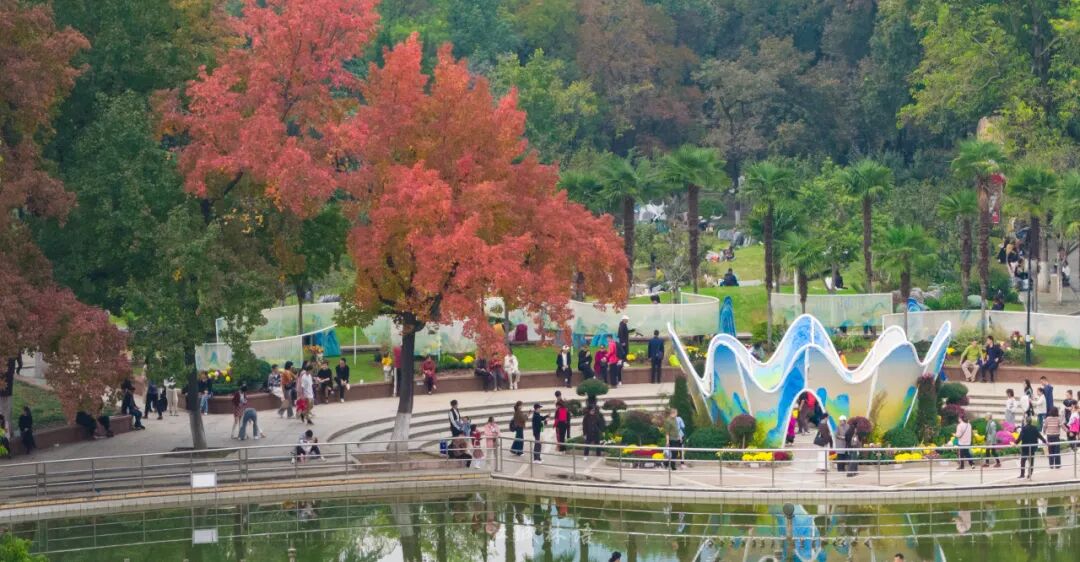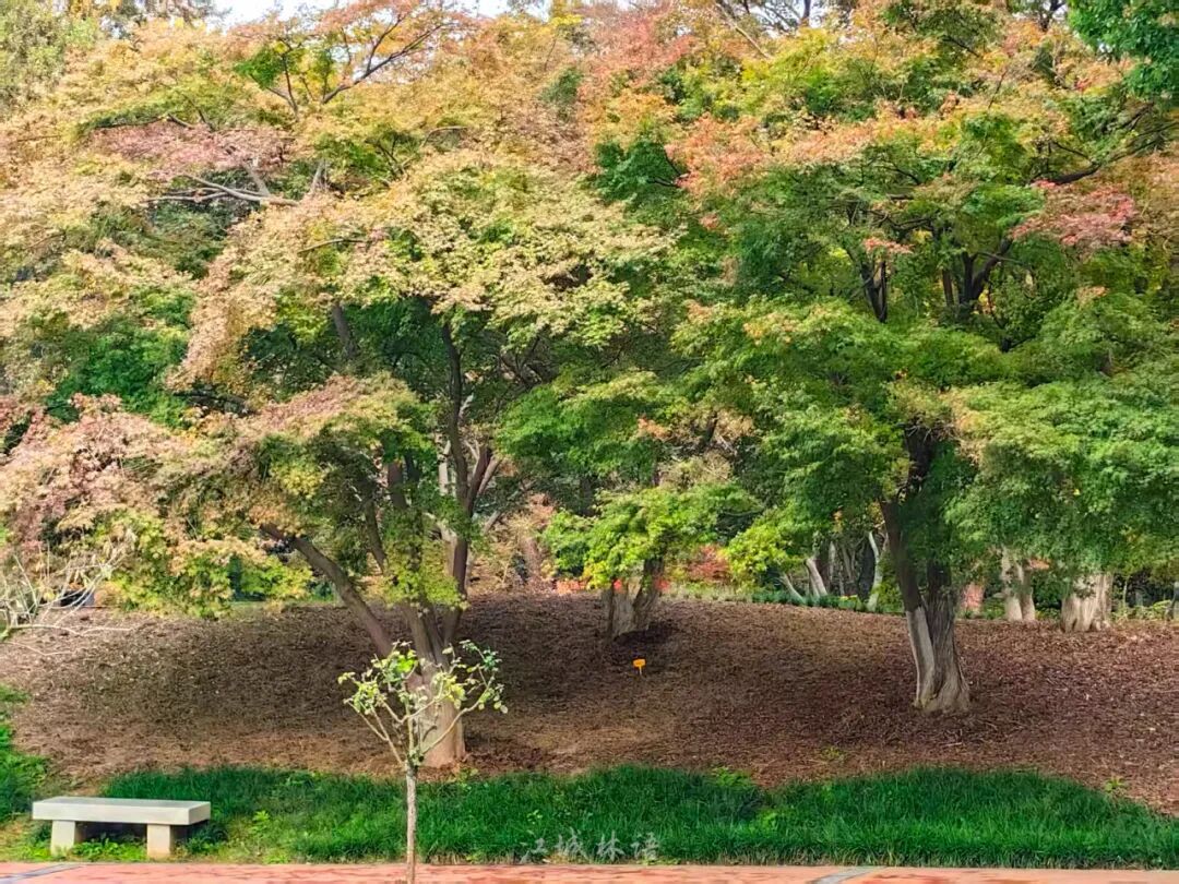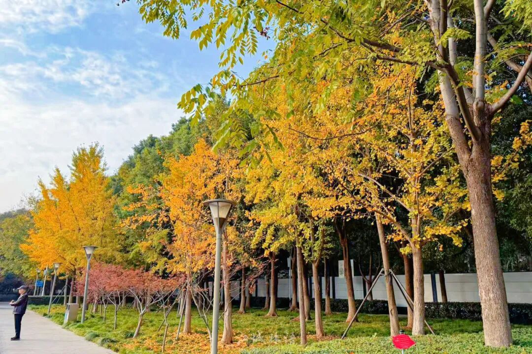 从1号门延伸至嘉卉广场的法桐大道,叶片正由绿转黄、由黄泛红,红黄绿交织,色彩斑斓如油画。流影坡与湿地区红艳动人的红枫,1号门树阵广场叶色如金的无患子,均成为热门打卡点。