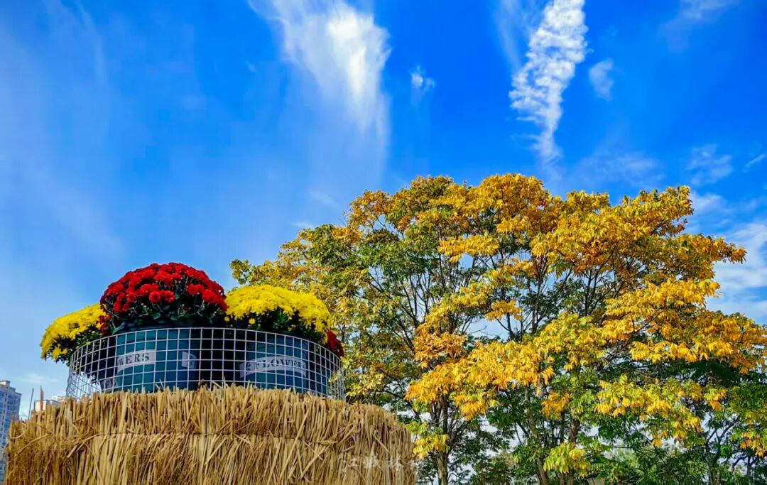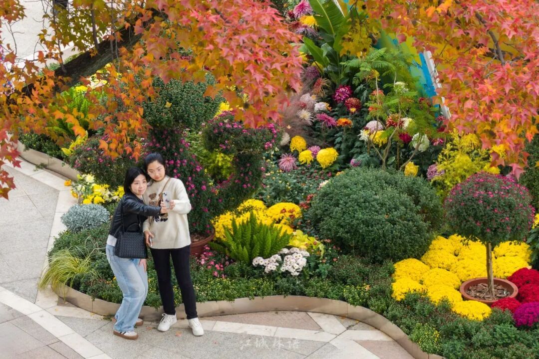 正在举办武汉金秋菊展的中山公园和沙湖公园,秋叶与菊花相得益彰。中山公园喷泉广场北侧卉涌景点,一株乌桕叶色全红,成为拍摄菊景的天然背景;站在南大门旁边的留春湖畔,可拍摄湖面菊花船与湖心岛彩叶的同框美景。沙湖公园C区中轴线东侧的枫林,树叶已染上秋色,市民入园后,可叶菊同赏。