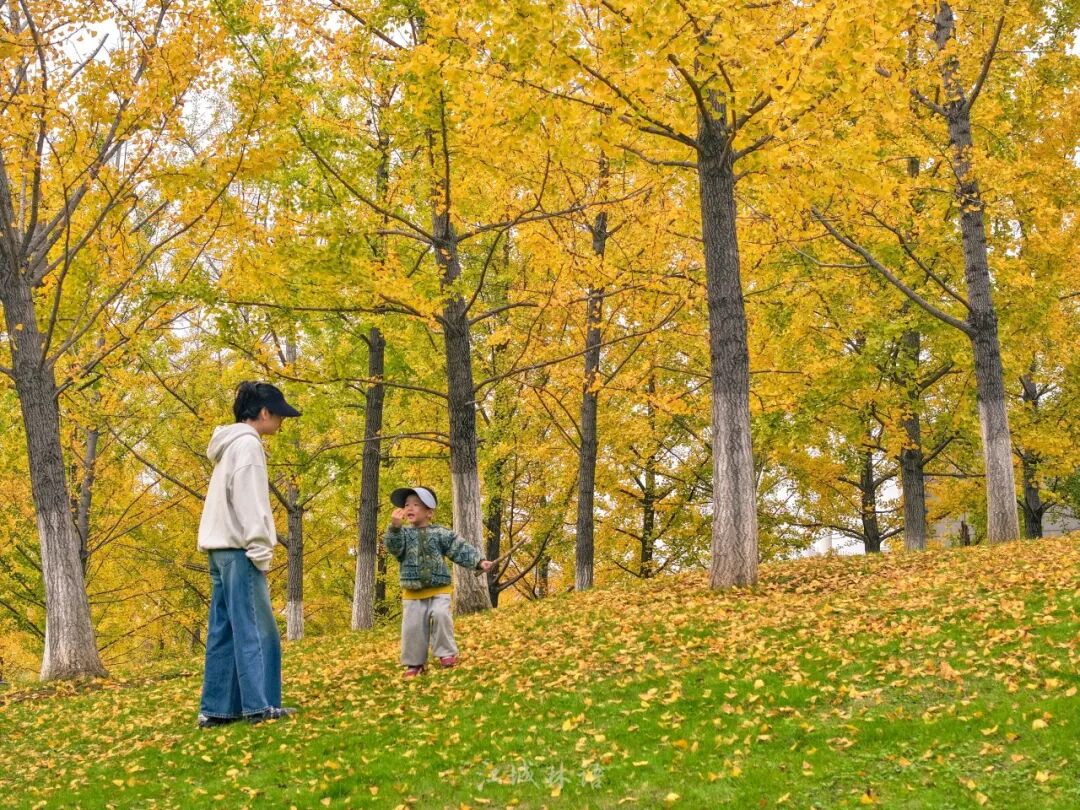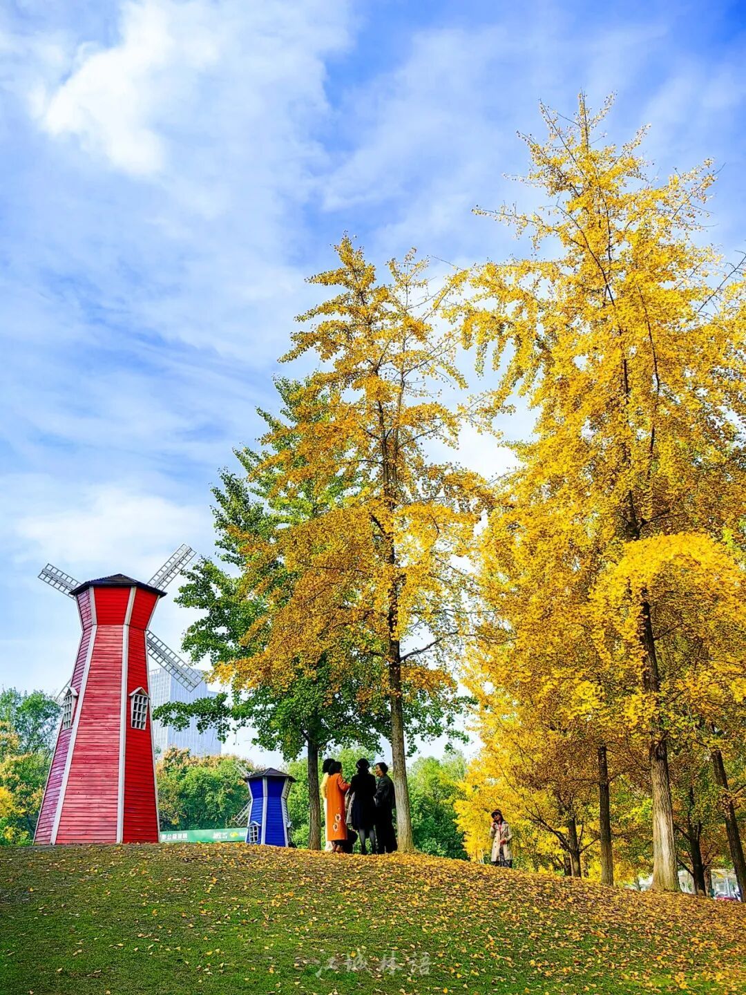 11日上午,小林在解放公园看到,2号门公孙坪上,20余株银杏连成一片金黄,与碧绿的草坪、红蓝两色的风车,勾勒出亮眼景致,吸引了众多市民观赏拍照。