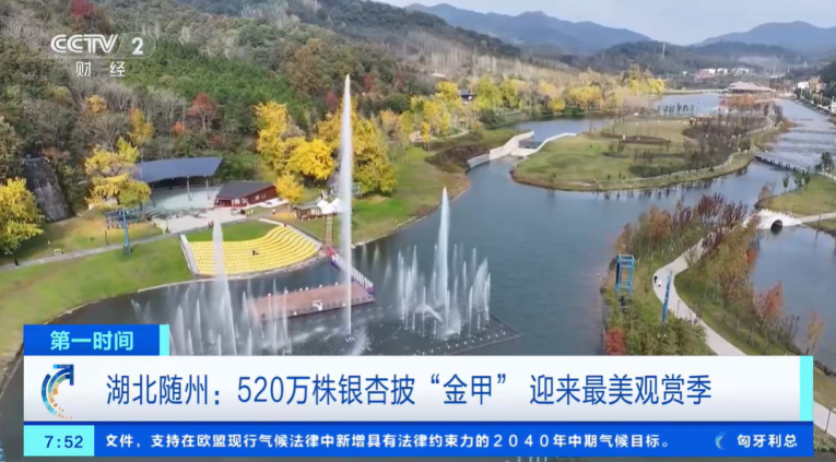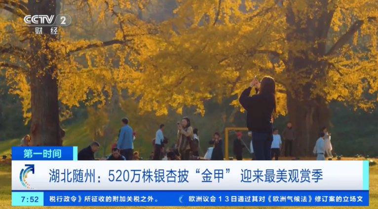 昨夜今晨,央视《第一时间》、《经济信息联播》等栏目以“520万株银杏披金甲”为题,连续报道了随州银杏谷迎来最佳观赏期的场景。湖北卫视《湖北新闻》也在持续关注随州银杏季。新闻画面中,随州千年银杏谷可谓满目金黄,游客畅游其间,感受独属银杏谷的唯美与浪漫。