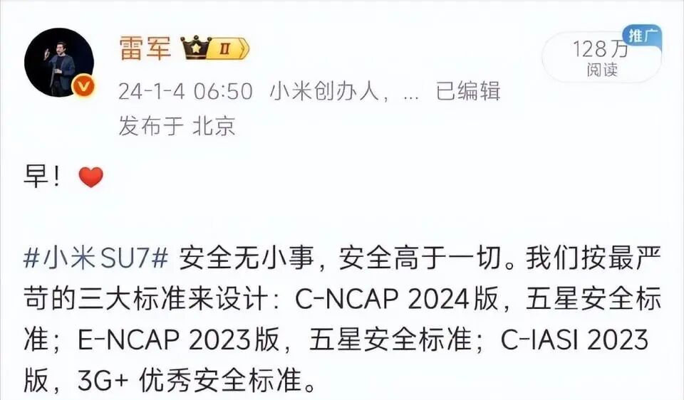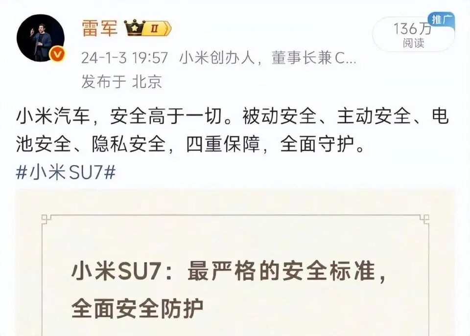 在此前的发文中,雷军曾多次强调“安全高于一切”。小米SU7按最严苛的三大标准设计:以2024版C-NCAP五星、2023版Euro NCAP五星及C-IASI 3G+为设计底线,覆盖被动安全、主动安全、电池安全与隐私安全四重保护。