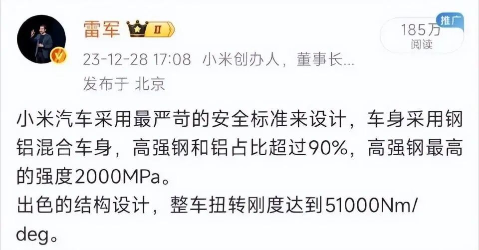 11月16日,雷军连发多条微博,重申小米汽车安全设计理念。