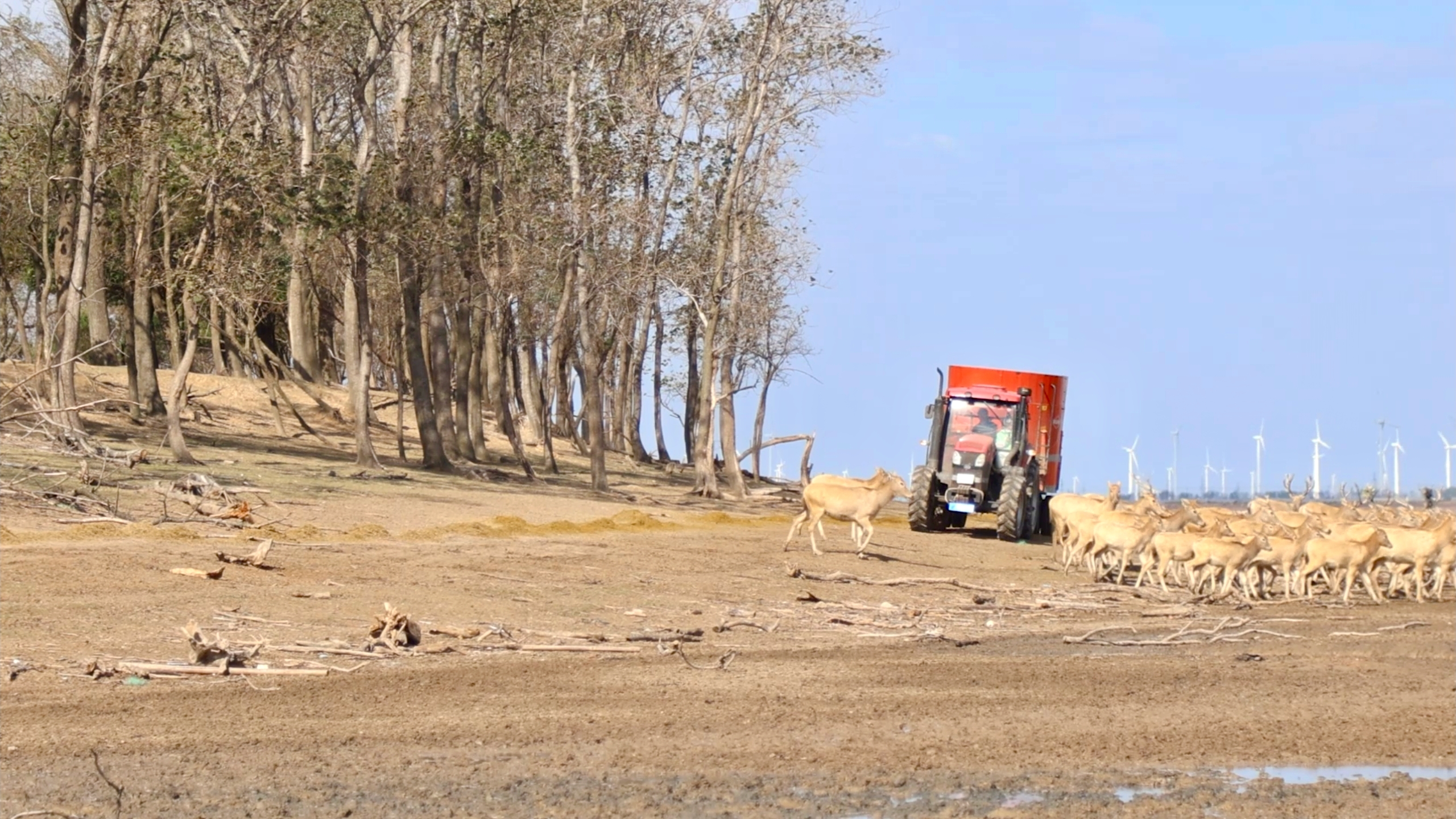 (2025年11月 补饲车在大丰麋鹿保护区核心散养区喂养麋鹿)