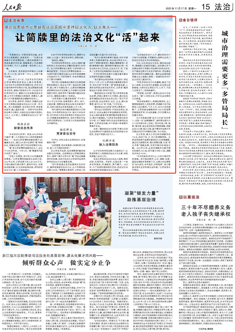 11月17日,《人民日报》刊文《让简牍里的法治文化“活”起来》,关注湖北云梦县保护、传承、传播中华文明瑰宝里蕴含的法治文化。具体内容如下: