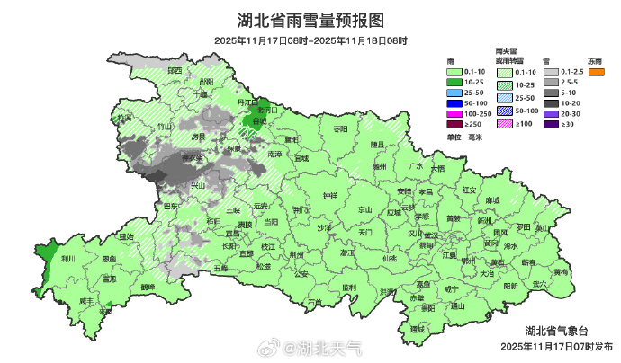 11月17日08时-18日08时,全省小雨转多云,局地中雨,其中鄂西北、鄂西南北部、鄂东北北部山区有雨夹雪或雪,西部高山地区有中到大雪。最高气温鄂西北4~7℃、鄂东南