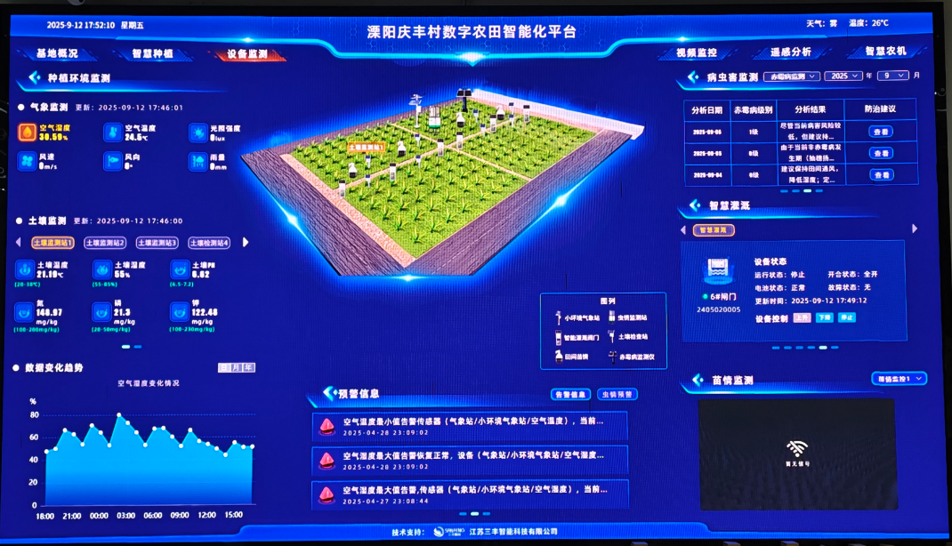 溧阳市岁丰农业公司技术员、庆丰村数字农田智能化平台管理员 任高磊:“田中间会放一个测定水分高低的仪器,在手机上遥控的话,它能实现阀门的自动关和送。通过地里的探棒可以监测到土壤氮磷钾养分的多少,去配比什么类型的复合肥。我们田间的病虫检测系统,通过夜间荧光的吸引,吸引成虫来灭杀。同时可以预知虫情的变化曲线,在幼虫期提前防治。”