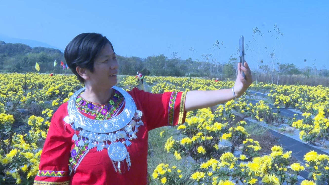金色的花海中,几位身着传统服饰的采摘工人正手持手机进行拍摄。“家人们看,这是我们金星村的金丝皇菊,朵朵饱满,香气扑鼻……”随着镜头的移动,连绵的花海、细致的采摘过程被呈现在手机屏幕上。