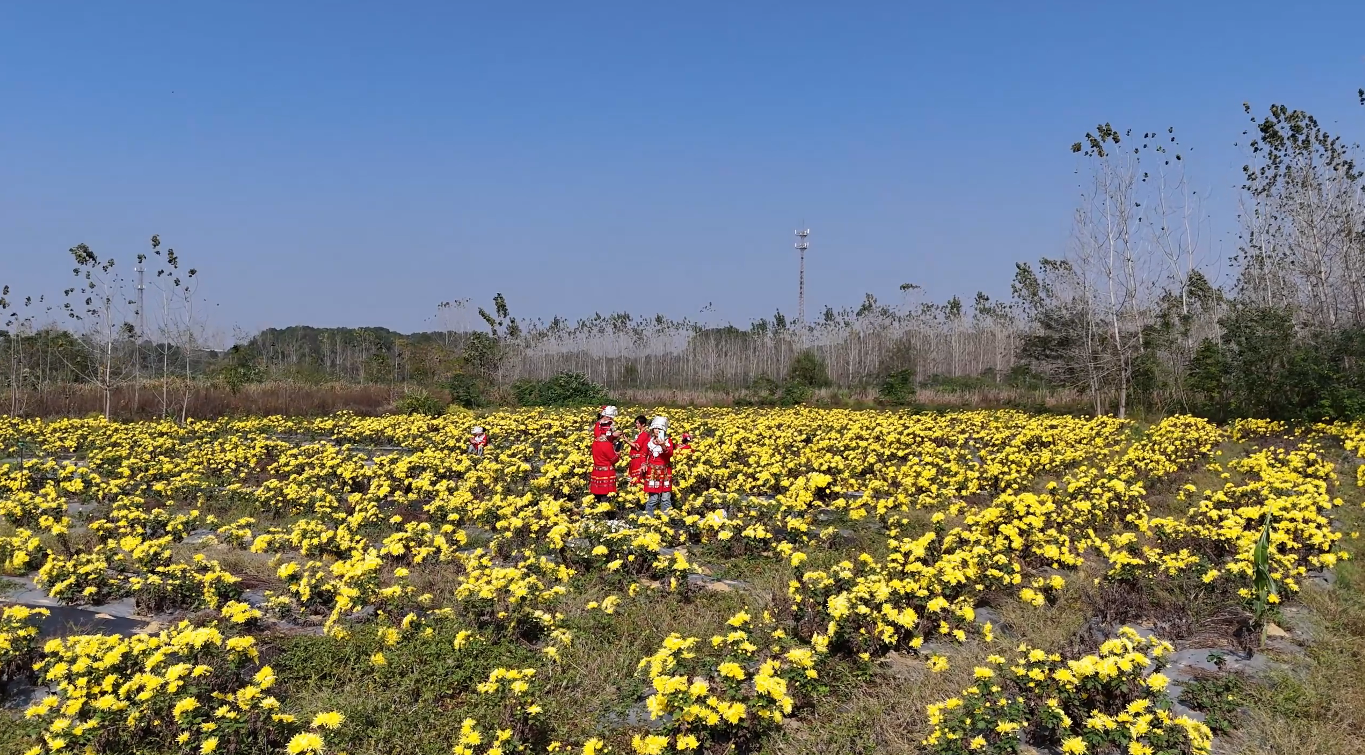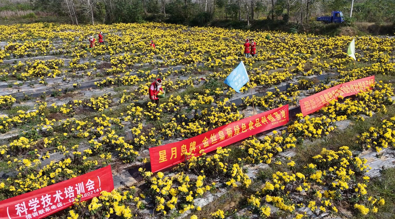 深秋时节,黄石市阳新县黄颡口镇金星村的200余亩金丝皇菊田里,金黄的花朵如繁星铺地,采摘工人穿梭其中忙碌采摘,菊香四溢,呈现出一派产业兴旺的丰收景象。