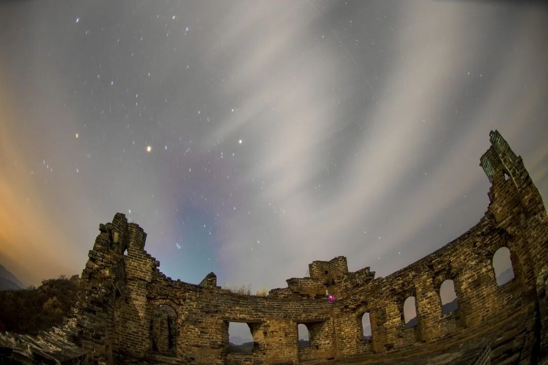△2022年11月18日凌晨,河北承德,一颗颗狮子座流星划过滦平县金山岭长城上空。