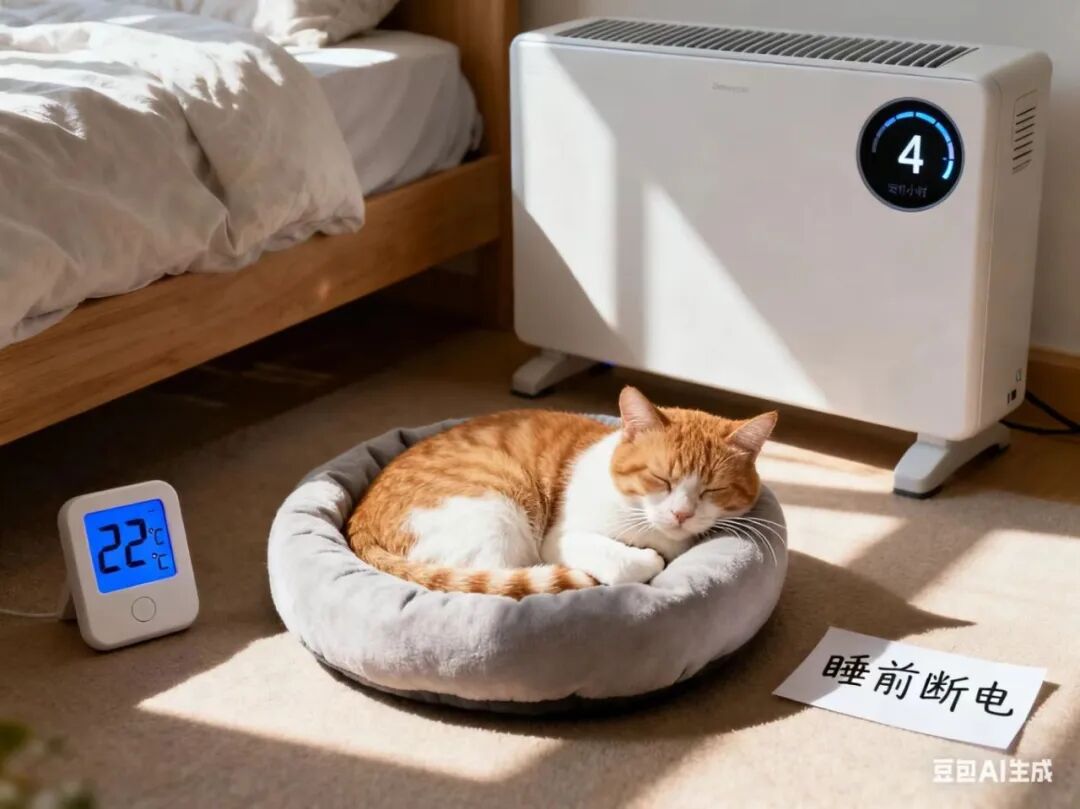 室温保持20℃-24℃,宠物最舒适,取暖器单次开≤4小时,宠物电热毯建议开启定时功能,睡前、外出必断电。