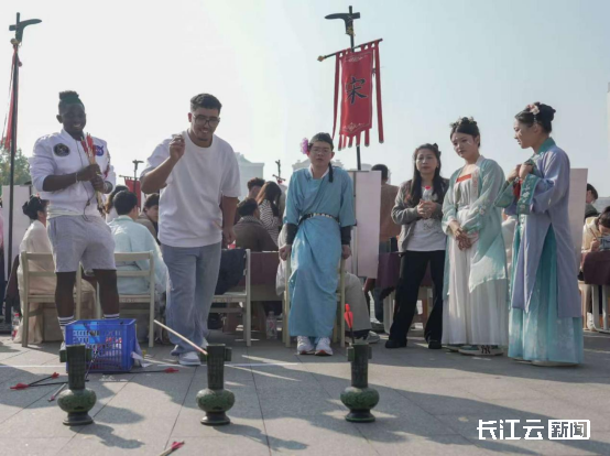 放眼整个活动现场,处处皆是生动的风景:画着宋代“珍珠妆”的女生与簪花的男生们在湖边蹴鞠;投壶区内,不时传来箭矢入壶的欢呼;文墨雅集区里,有人静心抄录词笺,也有人登台慷慨朗诵《满江红》。而精心设置的“多元一体:宋代的民族交融与文化共享”主题展,则通过榷场互市等历史图文,悄然揭示着中华文明兼容并蓄的宏大格局。