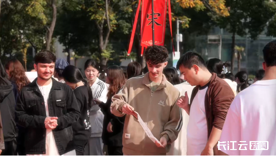 这股跨越时空的文化魅力,也深深吸引了国际学生的热情参与。他们身着汉服,在“大宋朋友圈”背景墙前打卡,努力用中文吟诵着苏轼、李清照的词句。“我从诗里学到了很多很好的词语。”国际学生兰华用流利的中文分享感受。来自摩洛哥的范月希则对仪式中的庄重感印象深刻:“我真的很喜欢中国人庆祝仪式的方式,尊重且庄重。”
