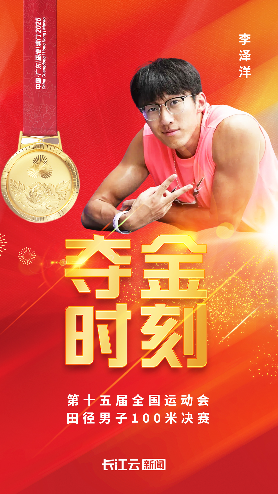 11月17日晚,在第十五届全国运动会田径男子100米决赛中,湖北选手李泽洋以10.11秒的成绩勇夺冠军,为湖北代表团斩获本届全运会第16枚金牌。